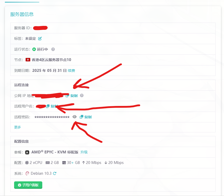 - 输入服务器的密码,这个在服务器的控制面板也能找到