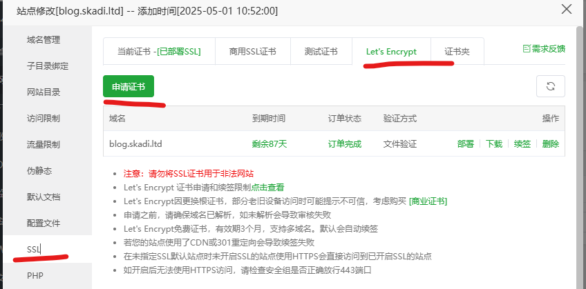 点击SSL——Let's Encrypt——申请证书