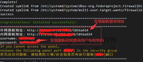 安装完成之后,我们会得到宝塔面板的后台登陆地址(复制到浏览器地址栏打开),以及默认的登陆用户名和密码(这个可以进入面板后再进行修改)